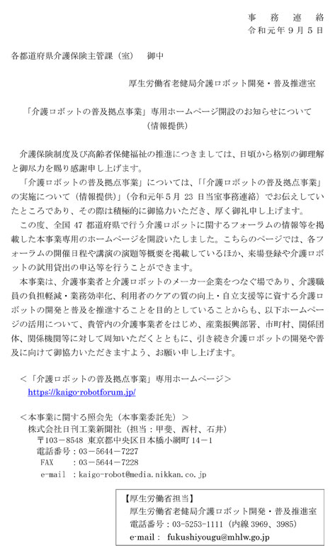 2019.09.19 【情報提供】「介護ロボットの普及拠点事業」専用ホームページ開設のお知らせについて ※画像をクリックするとPDFでご覧になれます。 (全4ページ 1,028KB) Tweet Share Hatena RSS