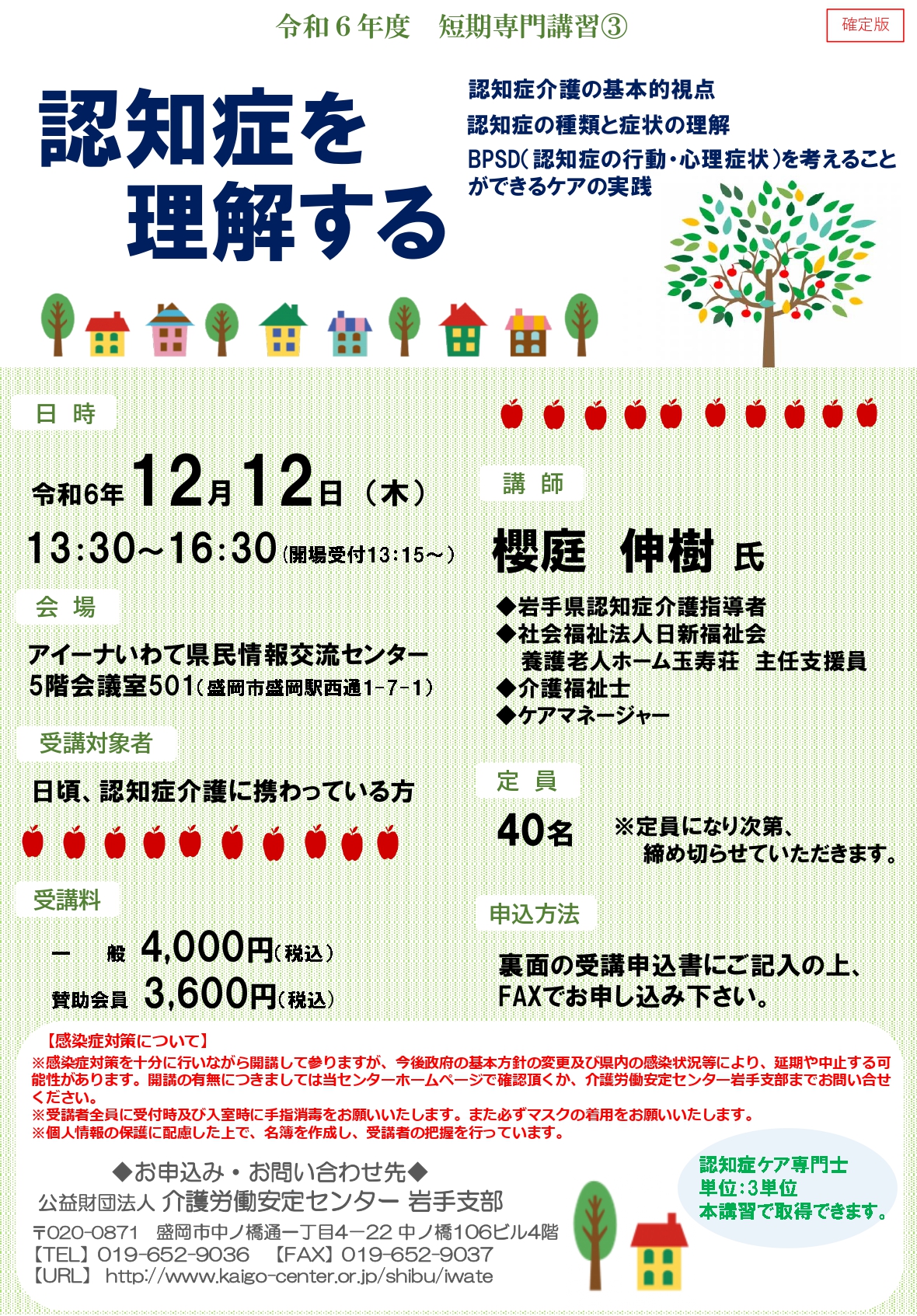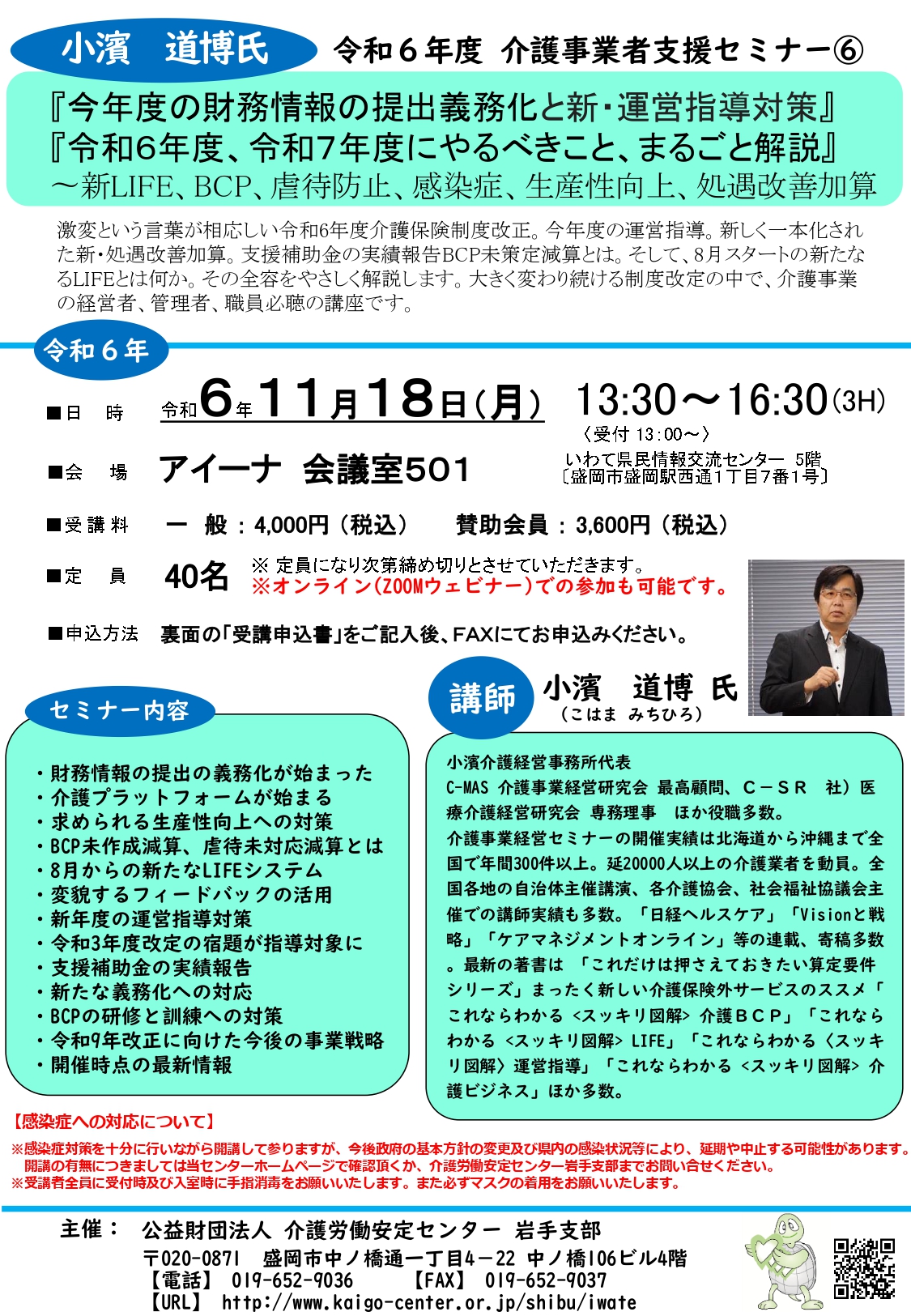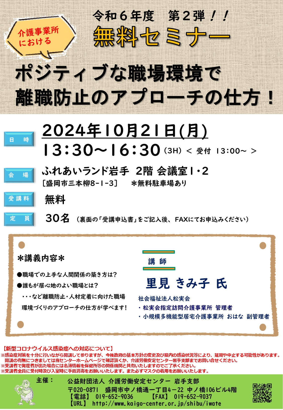 更新情報 岩手県介護労働安定センター主催セミナーのご案内 2024.10.8 更新情報 R6.10.21 無料セミナー 里見きみ子氏 R6.11.18 小濱道博氏 事業者支援セミナー⑥ R6.12.12 短期「認知症を理解する」(櫻庭氏) Tweet Share Hatena RSS