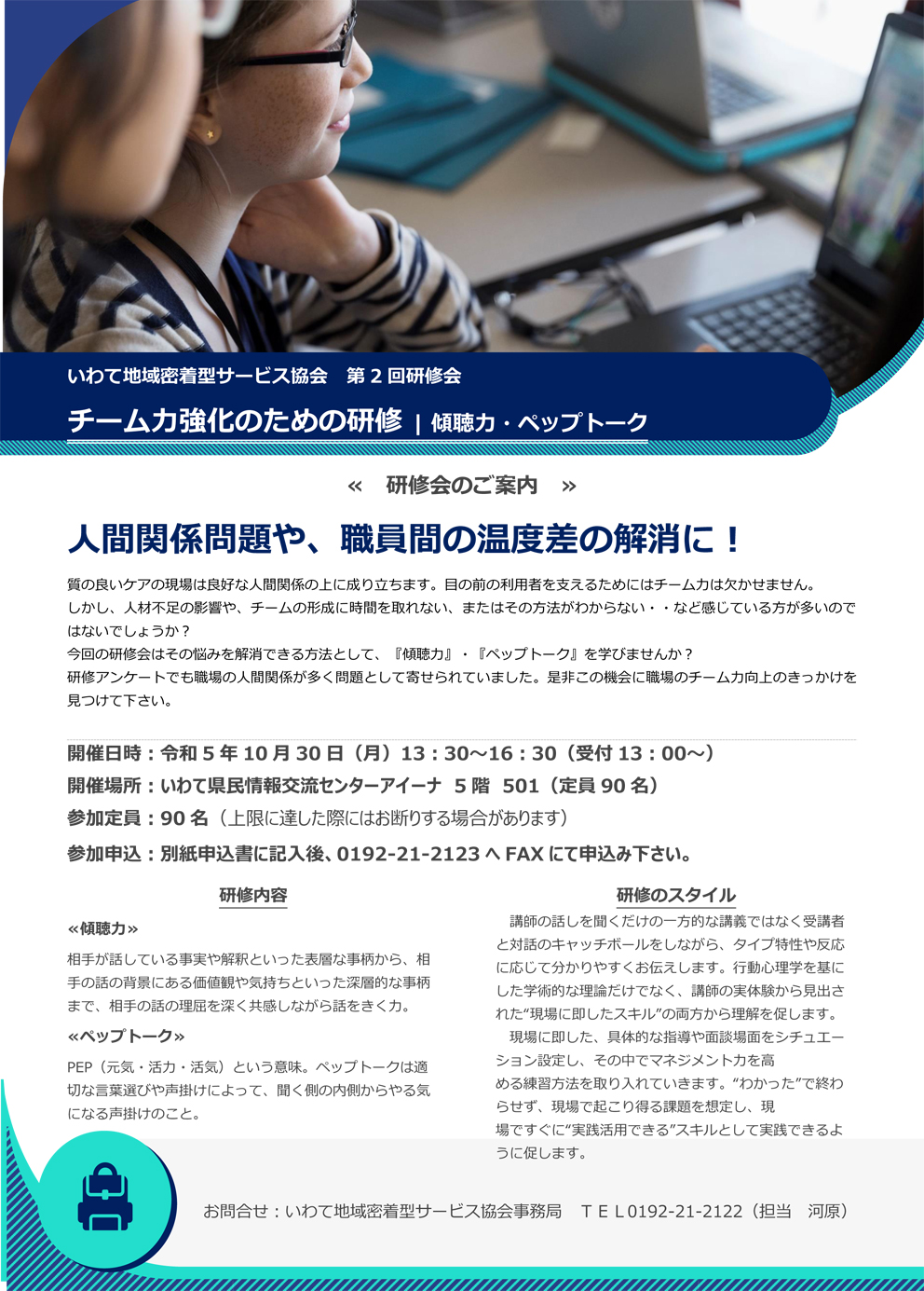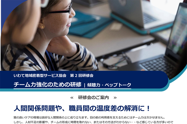更新情報 第2回研修会 いわて地域密着型サービス協会 2023.10.2 更新情報 チーム力強化のための研修 | 傾聴力・ペップトーク ■ 参加申込書 (word 14KB) ※画像をクリックするとPDFでご覧になれます。 Tweet Share Hatena RSS