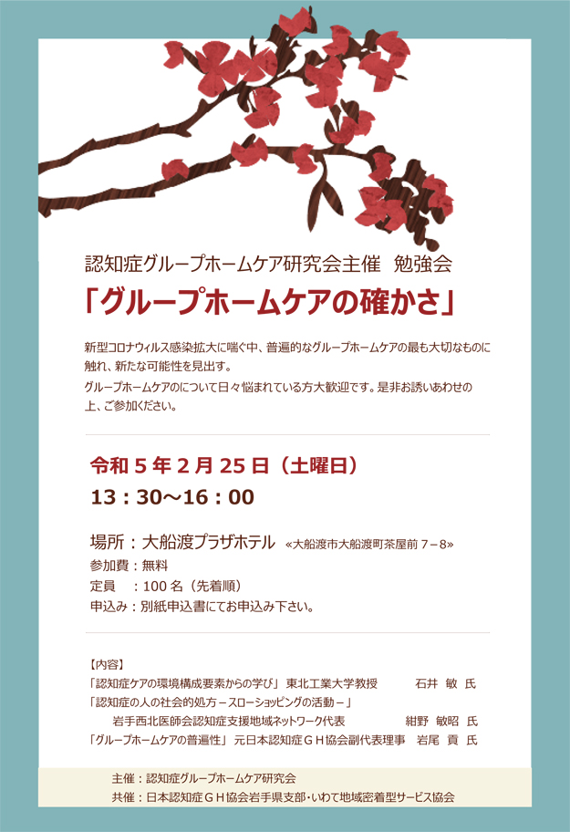 更新情報 2月25日(土)グループホーム対象研修会 2023.01.11 更新情報 【GH対象】認知症ケア研究会主催勉強会 当協会が共催する研修会のご案内※画像をクリックするとPDFでご覧になれます。 Tweet Share Hatena RSS